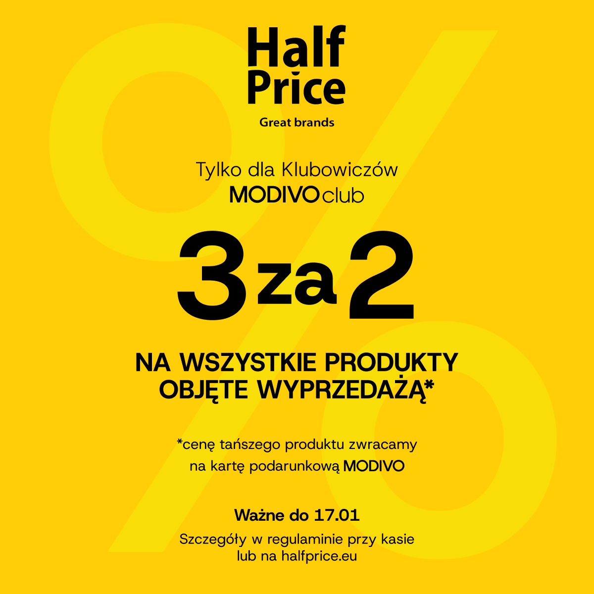 Akcja 3za2 w HalfPrice! Wybierz 3 produkty z wyprzedaży, a zwrot za najtańszy z nich otrzymasz na kartę podarunkową MODIVO! Światowe marki i wyjątkowe ceny czekają!