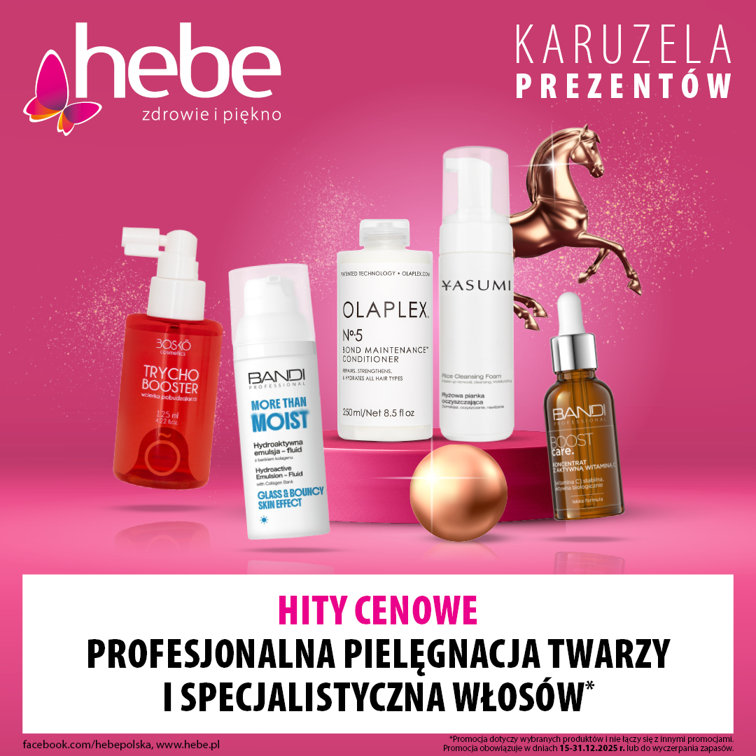 W hebe każdy znajdzie coś dla siebie. Miłośniczki kosmetyków znajdą tu niezbędne produkty do makijażu, pielęgnacji włosów i paznokci oraz duży wybór zapachów marek takich jak m.in. Jacques Battini, czy J. Del Pozo, które dostępne są tylko w tej sieci drogerii. hebe pomaga dbać nie tylko o urodę, ale również o zdrowie. W drogerii hebe dostępny jest szeroki wybór dermokosmetyków, produktów o działaniu specjalistycznym, dostosowanym do problemów skórnych. Są tu równiez świetne produkty do pielęgnacji ciała oraz profesjonalne kosmetyki stosowane w salonach kosmetycznych i SPA – marek takich jak np. Bandi, Beauty Lab, Purederm, czy Kallos, które kupić można wyłącznie w drogeriach hebe.